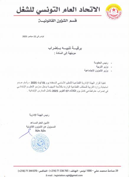 أصدرت الجامعة العامة للتعليم الأساسي برقية موجهة إلى رئيس الحكومة ، ووزير التربية ووزير الشؤون الاجتماعية تعلن فيها عن دخول مدرسي التعليم الابتدائي في إضراب عام قطاعي كامل يوم الثلاثاء 07 أكتوبر 2025 بكامل المدارس الابتدائية.