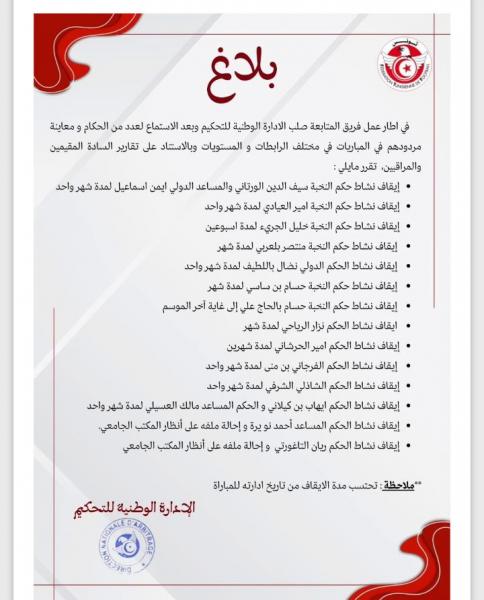 أعلنت الإدارة الوطنية للتحكيم عن جملة من العقوبات التأديبية في حق عدد من الحكام، وذلك في إطار متابعة مردودهم في مختلف المسابقات الوطنية.