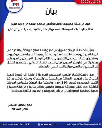 طالب حزب الاتحاد الشعبي الجمهوري، في بلاغ اليوم الاثنين 6 مارس 2020، وزارة الصحة بتوفير الإختبارات السريعة لكشف الإصابة بفيروس كورونا المستجد في منطقة القلعة من ولاية قبلي، تخوفا من الانتشار هذا الوباء بالجهة وحرصا على وقف تفشي العدوى.