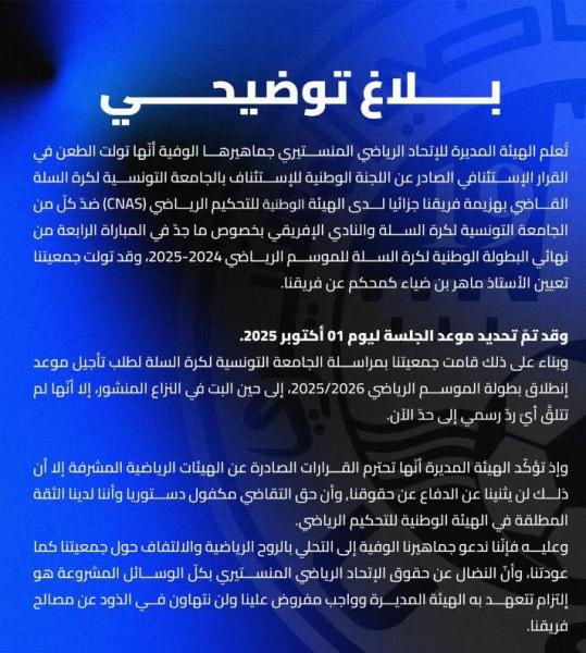 أصدرت الهيئة المديرة للاتحاد الرياضي المنستيري بلاغا على صفحتها الرسمية أعلنت فيه أنها تقدّمت بطعن لدى “الكناس” ضد الجامعة التونسية لكرة السلة والنادي الإفريقي، وذلك على خلفية القرار الاستثنائي الصادر عن اللجنة الوطنية للاستئناف بالجامعة والقاضي باعتبار الاتحاد منهزمًا جزائيًا في المباراة الرابعة من نهائي الموسم الماضي.