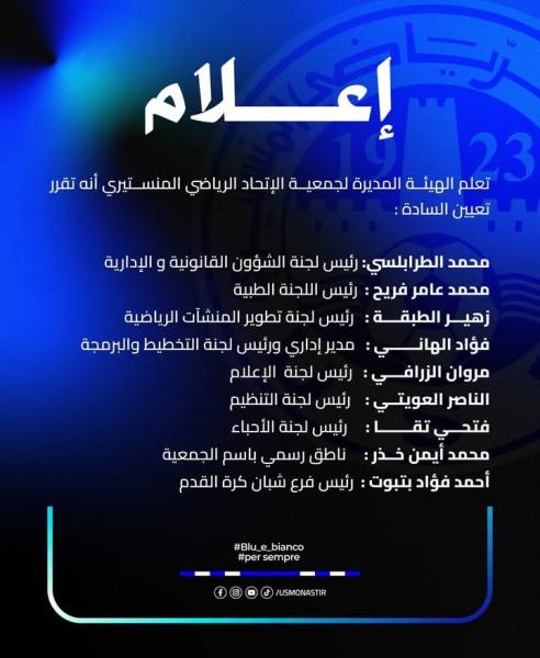 أعلن فريق الإتحاد الرياضي المنستيري عبر صفحاته الرسمية على مواقع التواصل الاجتماعي عن جملة من التعيينات الجديدة في الهيئة المديرة للفريق والتي كانت على النحو التالي :