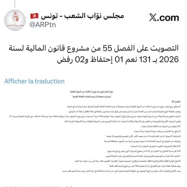 - صوت النواب بالبرلمان مساء اليوم لصالح حق كل عائلة( مقيمة) في سيارة من الخارج أو ما يعرف بالفصل 55منمشروع قانون المالية لسنة 2026 وذلك ب 131صوتا مع واحتفاظ واحد ورفض اثنين .ووفق ما ورد في مسودة القرار فان عمر السيارة لايجب أن يتجاوز 8سنوات .و أن لايجب ان يتجاوز الدخل الفردي للمنتفع 10مرات الدخل الشهري الخام.