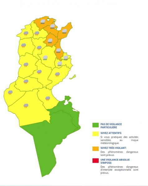 وقد نشر المعهد الوطني للرصد الجوّي خارطة اليقظة، داعيا سكان ولايات تونس الكبرى وسوسة وزغوان ونابل وبنزرت إلى توخّي أعلى درجات الحذر.