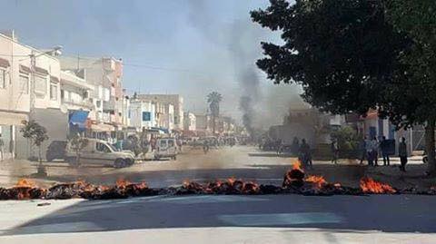 وقد عمد بعض المتساكنين الى غلق الطريق عبر احراق العجلات المطاطية ووضع الحجارة في محاولة لمنع مرور عربات الامن قبل ان ينجح الاعوان في تفريقهم .