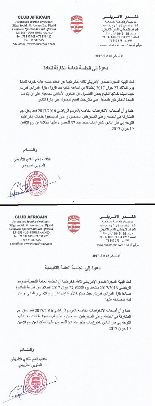 أعلنت الكتابة العامة لإدارة النادي الإفريقي في بلاغ لها كافة منخرطيها إلى حضور جلسة عامة تقييمية وأخرى خارقة للعادة يوم الثلاثاء 27 جوان 2017.