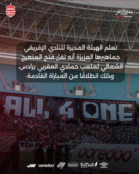 أعلنت الهيئة المديرة للنادي الافريقي أنه تقرر فتح المنعرج الشمالي لملعب حمادي العقربي برادس انطلاقا من المقابلة المقبلة