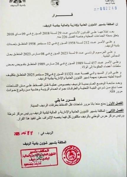 قررت المكلفة بتسيير الشؤون الإدارية والمالية لبلدية الرديف من ولاية قفصة منع شاحنات نقل الفسفاط من المرور بوسط المدينة حفاظا على البنية التحتية للطرقات.