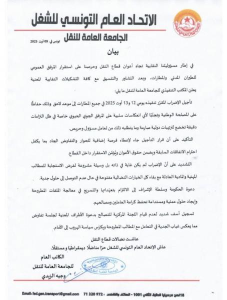 أعلنت الجامعة العامة للنقل التابعة للاتحاد العام التونسي للشغل، في بيان اليوم السبت 9 أوت 2025، تأجيل الإضراب الذي كان من المقرر تنفيذه يومي 12 و13 أوت الجاري في جميع المطارات، إلى موعد لاحق.