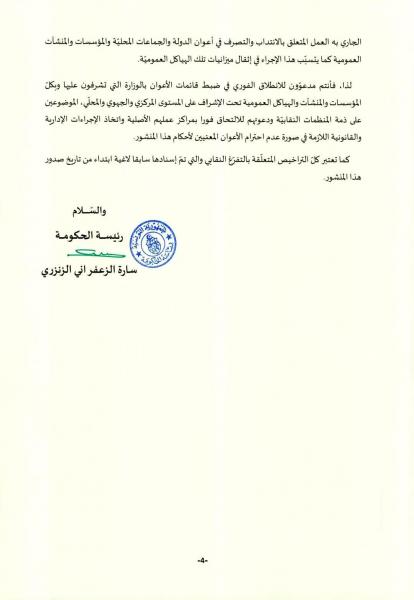 اصدرت رئاسة الحكومة اليوم الخميس منشورا ينهي التفرغ النقابي وينص على إلغاء كل التراخيص الممنوحة سابقا تحت عنوان " تفرغ نقابي "