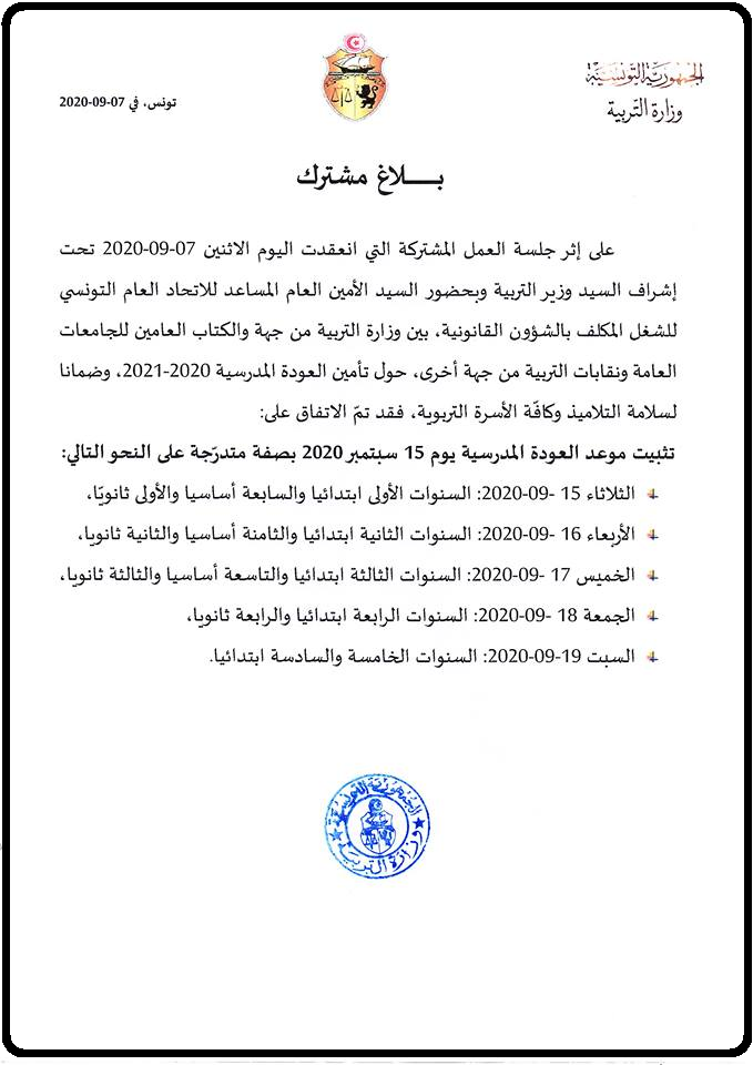 قررت وزارة التربية اليوم الإثنين 7 سبتمبر 2020 تثبيت قرار العودة المدرسية وذلك بعد اجتماع انعقد بين وزير التربية والأمين العام المساعد لاتحاد الشغل .