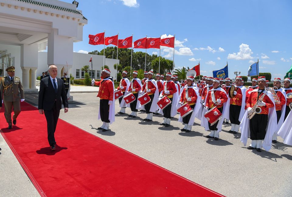 ولدى حلوله بمطار تونس قرطاج الدولي استعرض رئيس الجمهورية تشكيلة من الجيوش الثلاثة أدت له التحية، قبل تحية العلم على أنغام النشيد الوطني.