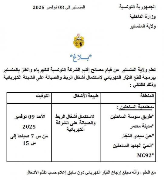 حسب البلاغ الصادر عن ولاية المنستير سيتم تسجيل انقطاع التيار الكهربائي ببعض المناطق التابعة لمعتمدية الساحلين لاستكمال أشغال الربط على الشبكة الكهربائية و ذلك يوم غد الأحد 9 نوفمبر 2025 بداية من الساعة السابعة صباحا و إلى غاية الساعة الثالثة بعد الزوال و سيتم إرجاع التيار الكهربائي مباشرة بعد اتمام انجاز الأشغال ودون سابق اعلام .