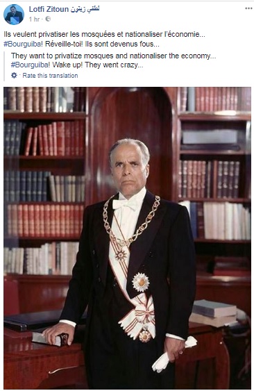 في تدوينة له على " فايسبوك " مضى عليها حوالي ساعة وجّه القيادي والمستشار في حركة النهضة لطفي زيتون صيحة فزع واستغاثة إلى رئيس تونس الأسبق الراحل الحبيب بورقيبة قال فيها بالحرف الواحد :" إنهم يريدون خوصصة المساجد وتأميم الاقتصاد ...إنهض ( أو إستيقظ ) يا بورقيبة ... إنهم أصيبوا بالجنون " .