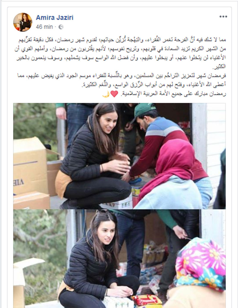 وها نحن نرى اليوم زوجة يوسف المساكني تلتحق بهذه " المدرسة " فتنشر العديد من الصور التي تظهر فيها وهي " تساعد الفقراء " حسب تعبيرها . ولعلّ الأتعس من نشر الصور أن تتبجّح بأنها " غنيّة " وبأن الفقراء ينتظرون كل عام شهر رمضان بالفرحة الكبيرة وبفارغ الصبر لأن الأغنياء يحنّون عليهم .
